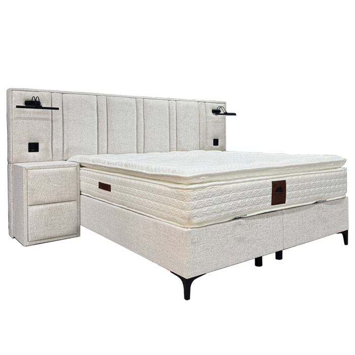 Transformeer je slaapkamer met de elegante Boxspring Infinity, de perfecte combinatie van luxe, comfort en praktische functionaliteit. Deze complete set biedt niet alleen een moderne uitstraling, maar ook alles wat je nodig hebt voor een optimale nachtrust en een opgeruimde kamer. De boxspring is bekleed met een zachte teddy bouclé stof in offwhite, wat zorgt voor een warme en tijdloze sfeer.