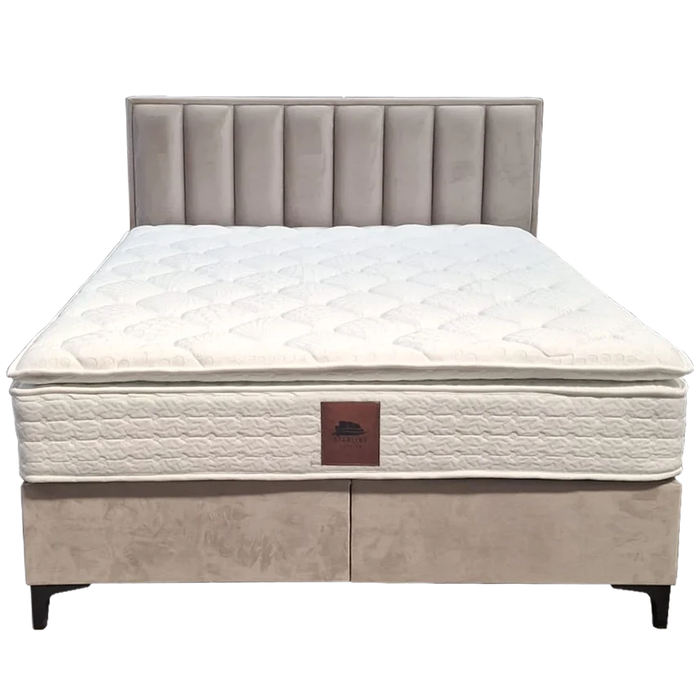Het design wordt gekenmerkt door het verticale gestreepte hoofdbord, dat een subtiel maar luxe accent toevoegt. De bekleding voelt zacht aan en geeft het geheel een warme en verfijnde look.