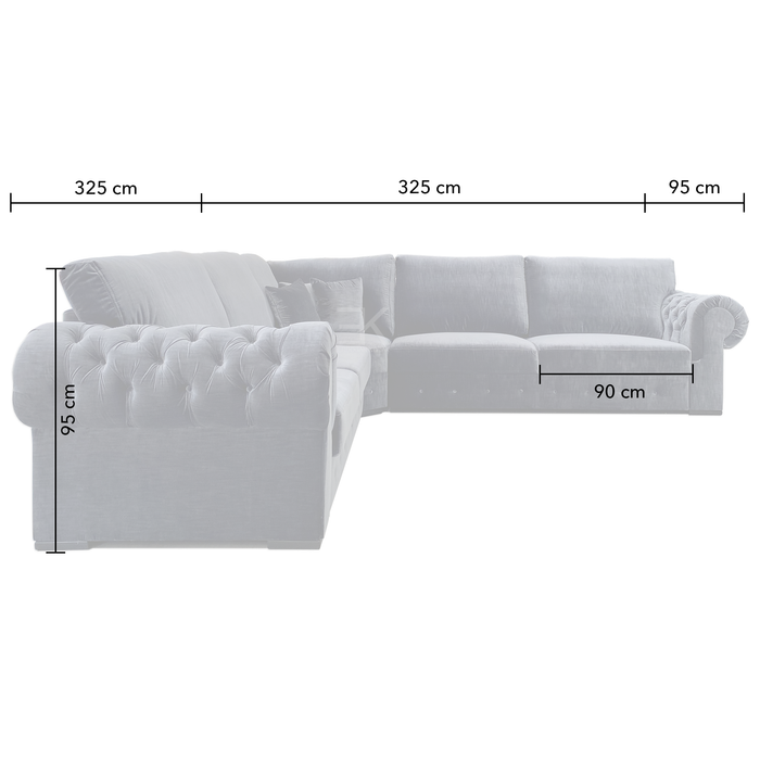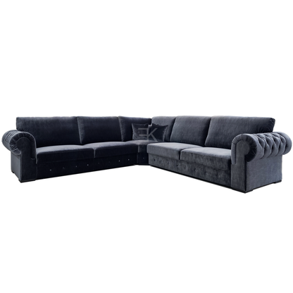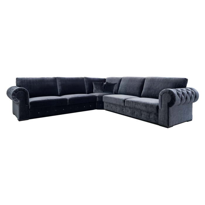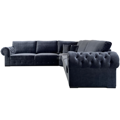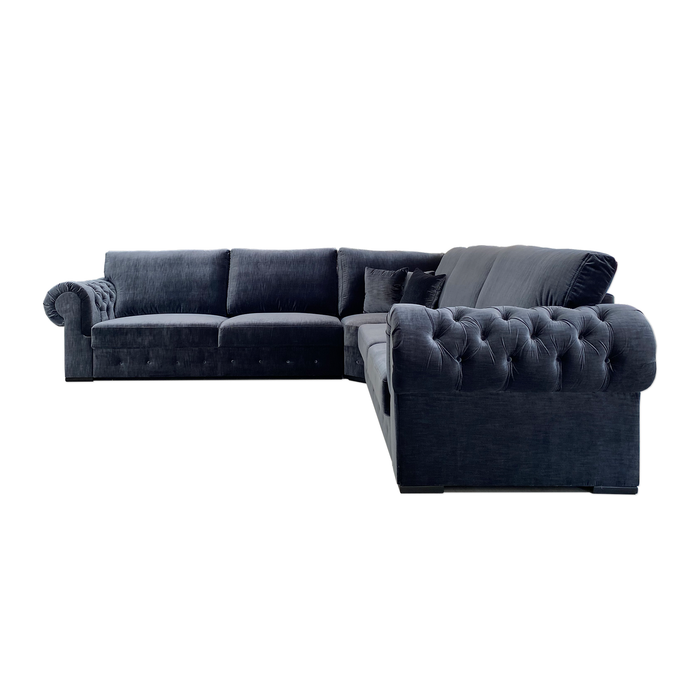 Hoekbank Fortes is een ruime sierlijke bank met een klassiek design. Mede door de gecapitonneerde rondingen van de armleuningen krijgt de bank een unieke uitstraling. Alle rug-kussens en losse kussens zijn tevens voorzien van ritsen. De bekleding bestaat uit Kemer Velvet 805 in Marineblauw kleur.