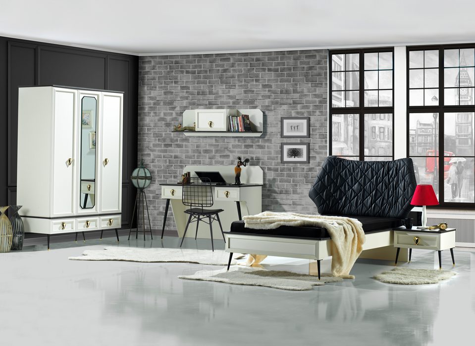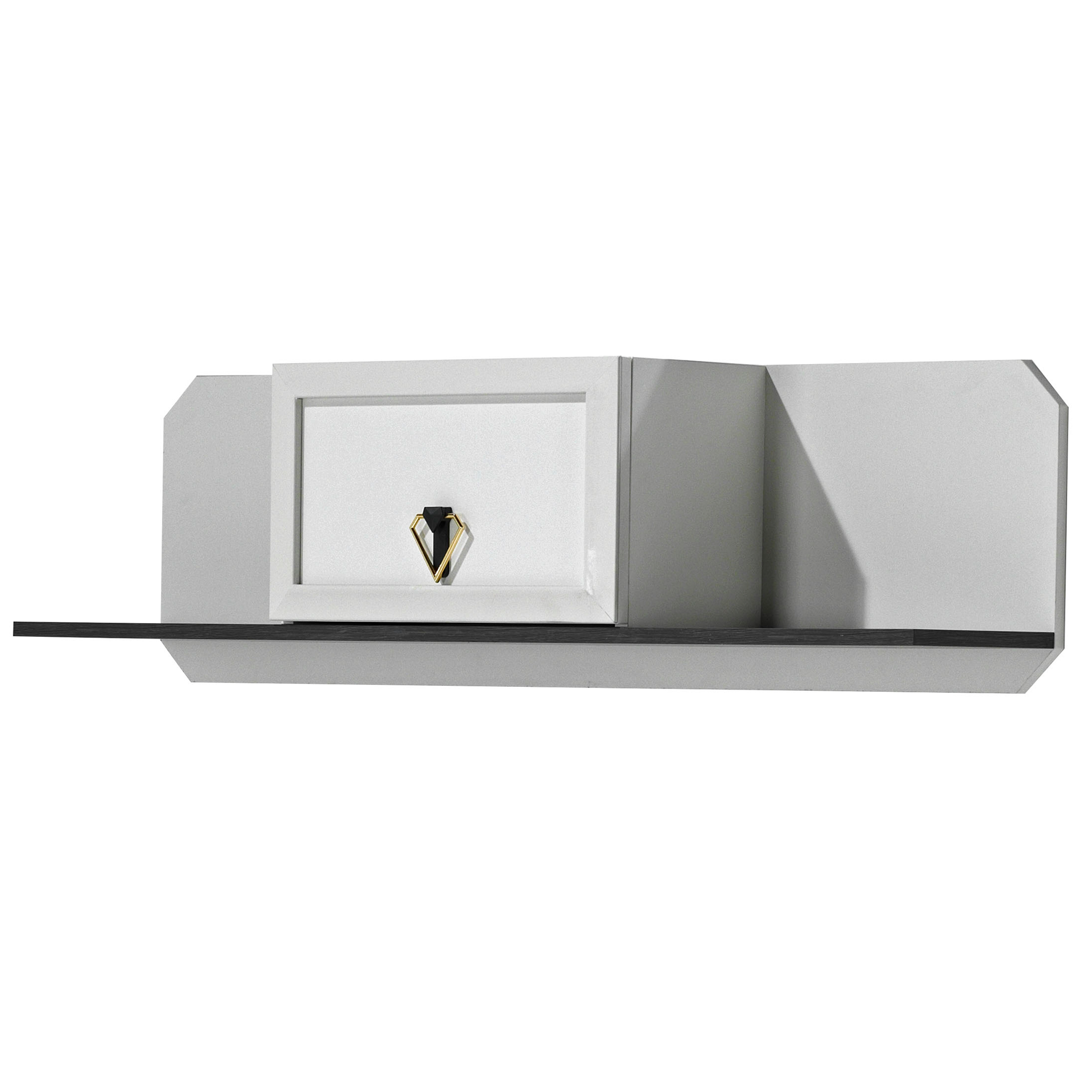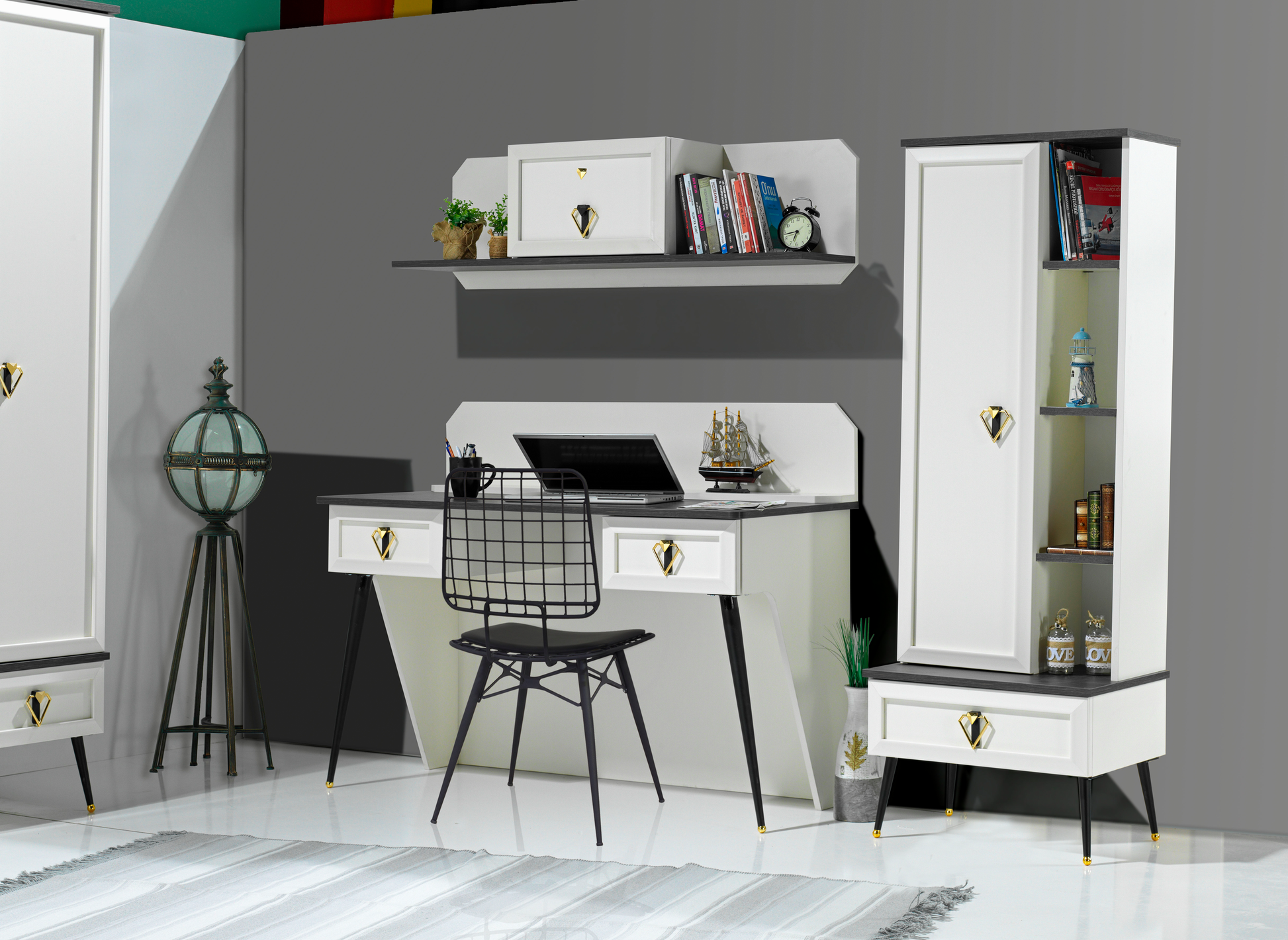 Dit unieke, crème/goud, hout klassiek-geïnspireerde wandmodule is afkomstig uit de 'Mega Crème' collectie en heeft een warme uitstraling. De draaideur en planken geven het meer dan genoeg opbergmogelijkheden. De wandmodule is onderdeel van de kinderslaapkamer set 'Mega Crème'.