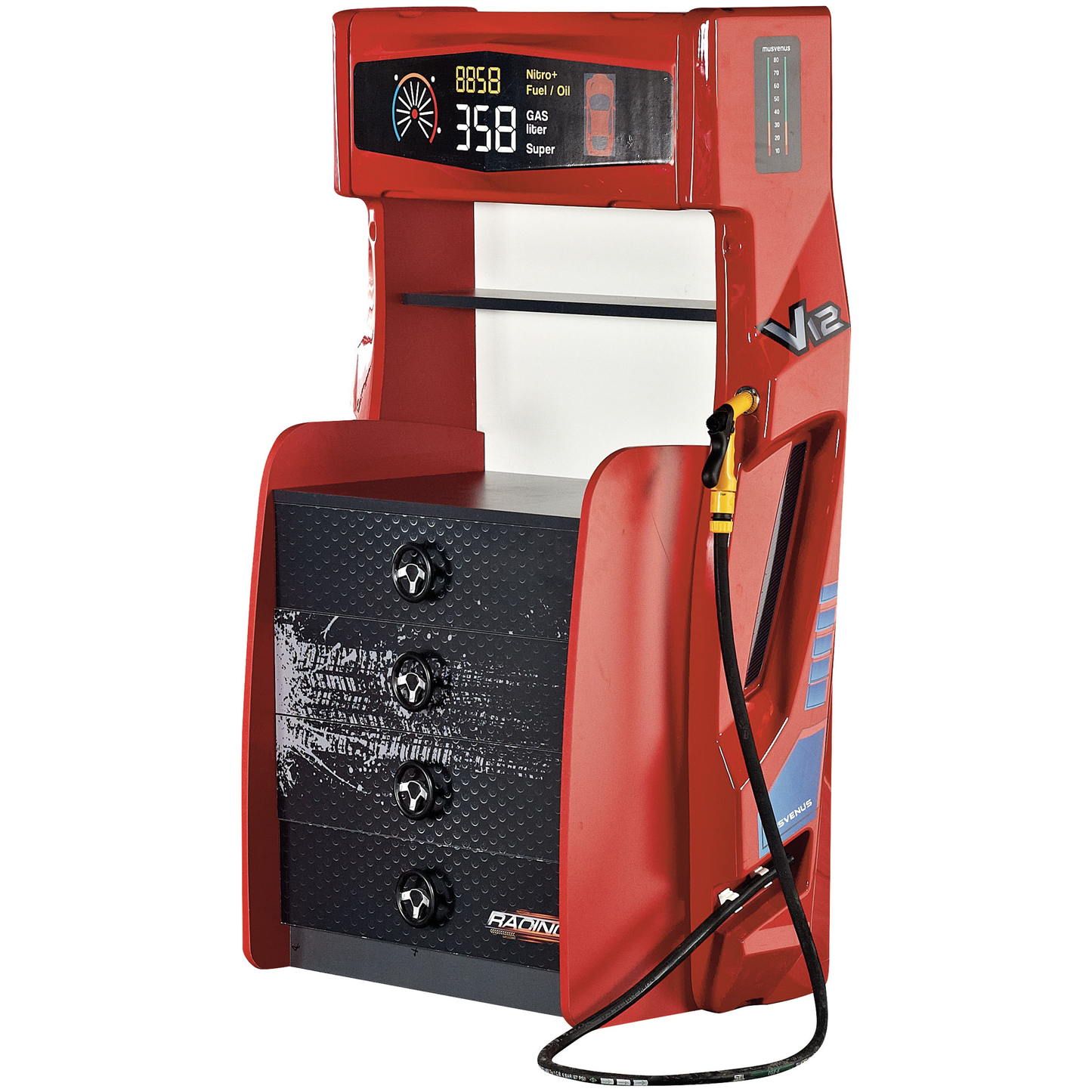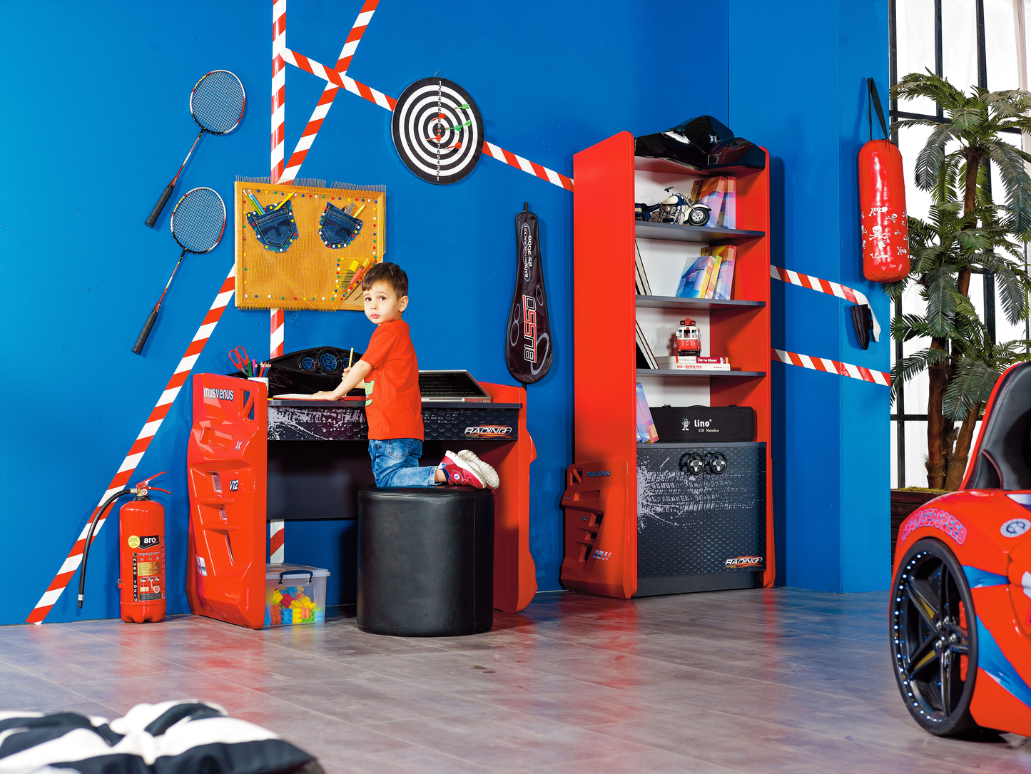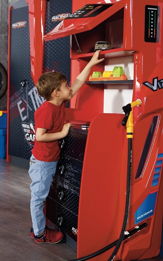 Dit unieke, Formule 1 geïnspireerde commode is afkomstig uit de 'Racing' collectie en heeft een stoere uitstraling. Door gebruik van 4 grote lades en 2 open vakken zijn er veel opbergmogelijkheden. De commode is onderdeel van de kinderslaapkamer set 'Racing'.